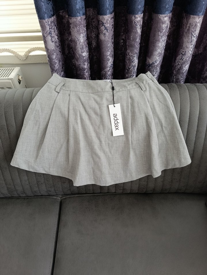 Addax markalı, keten kumaştan yapılmış gri mini etek. Pilili ve bol kesim yapısıyla günlük sokak stiline uygundur.