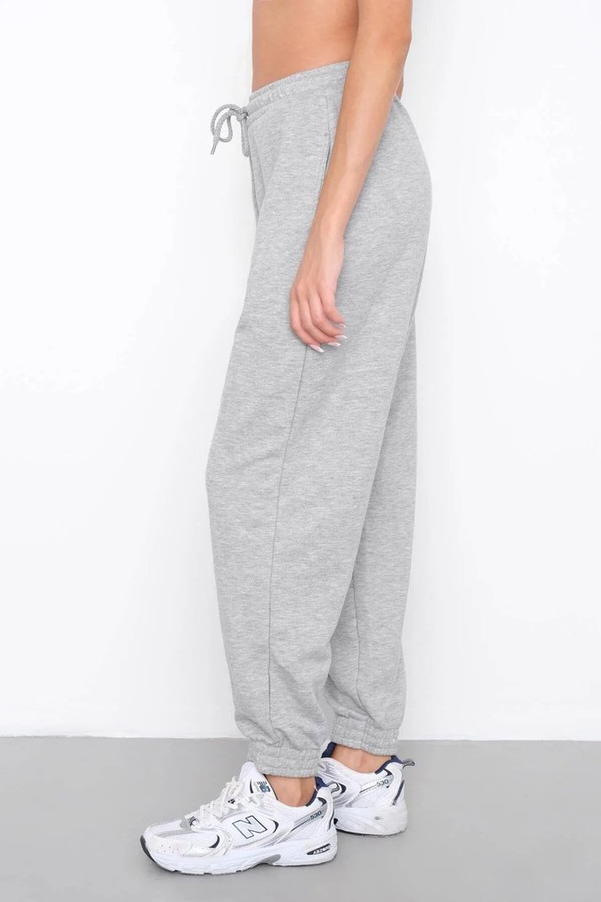 Gri renkli, bol kesim ve normal boyda, yumuşak ve sıcak kumaştan kadın manşetli eşofman altı.