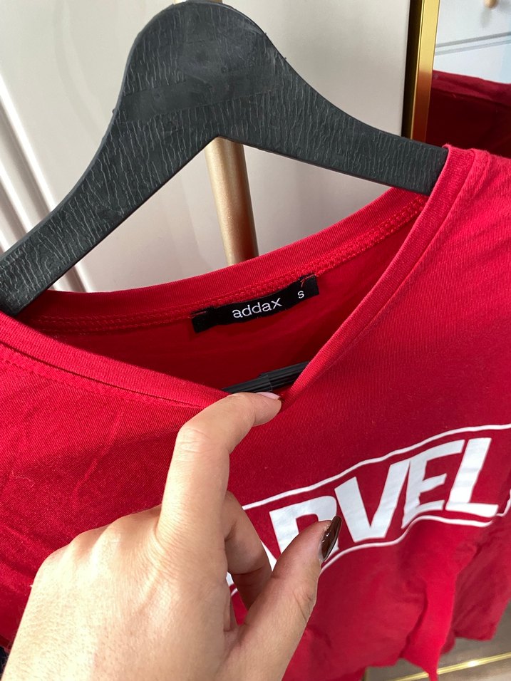 Addax markalı kırmızı kadın tişört, V yaka ve kısa kolludur. Bol kesimi, parlak baskısı ve cırt cırt detaylarıyla spor şıklık sunar. ♀️