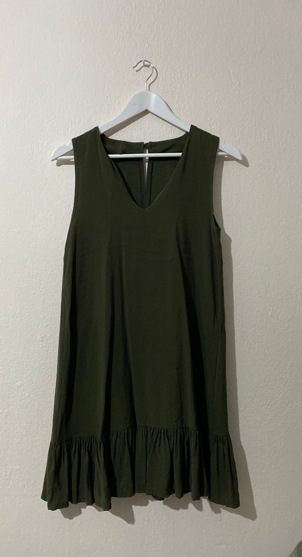 Kolsuz, V yakalı, bol kesim ve midi boy haki elbise. Yumuşak sentetik kumaştan, minimal ve desensiz, rahat sokak stili için uygun.
