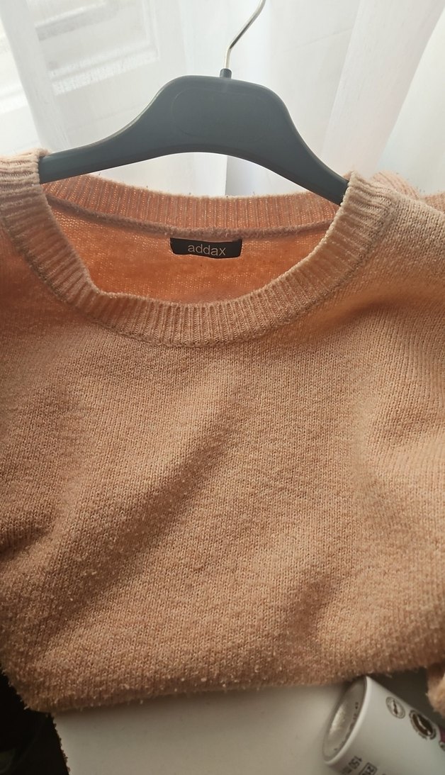 Addax markalı, parlak kahverengi yün örgü kazak. Yuvarlak yaka, uzun kollu ve bol kesim ile rahat ve günlük kullanıma uygun.