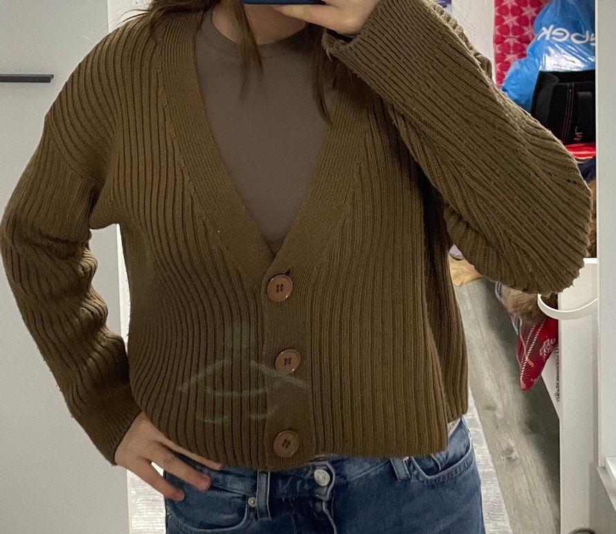 Kahverengi, V yaka, uzun kollu, midi boy, bol kesim triko kadın hırka, günlük rahat kullanım için uygundur.