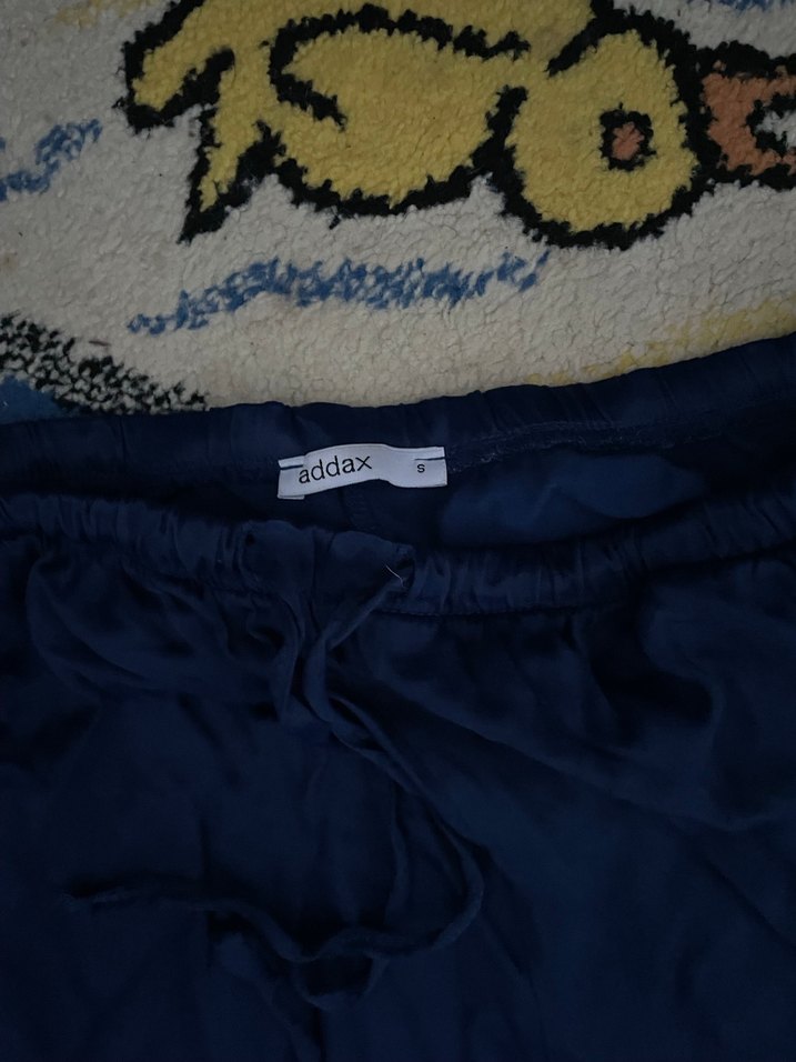 Addax markalı lacivert renkli, sentetik kumaştan üretilmiş, fermuarlı ve rahat kesim midi boy kadın pantolon. Sokak stiline uygun ve dış mekan kullanımı için ideal.