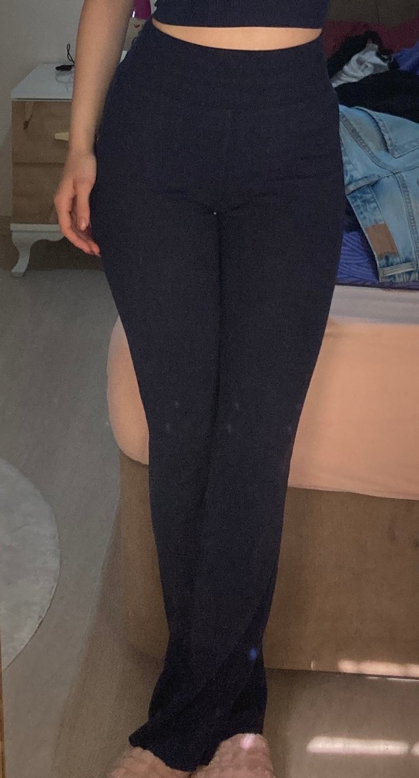 Lacivert, midi boy, vücudu saran wide leg tayt pantolon. Günlük sokak stiline uygun rahat ve şık bir parça.