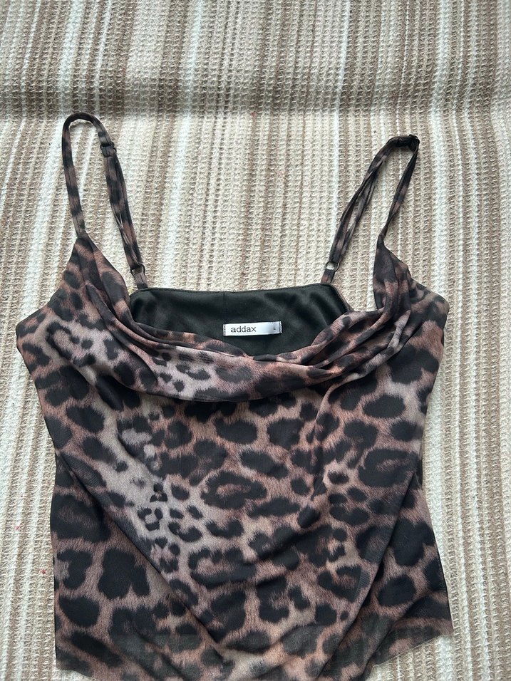 Addax marka, suni kumaştan yapılmış, drapeli ve leopar desenli, askılı, dar kesim kadın atlet. Günlük rahat kullanıma uygun midi uzunluğunda.