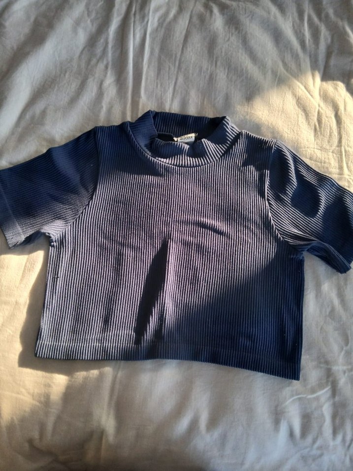 Mavi, fitilli esnek polyamid kumaş, yuvarlak yaka ve kısa kollu, bluz. Günlük kullanıma uygundur. M/L Beden uyumludur. Az kullanılmış ve yeni gibidir.