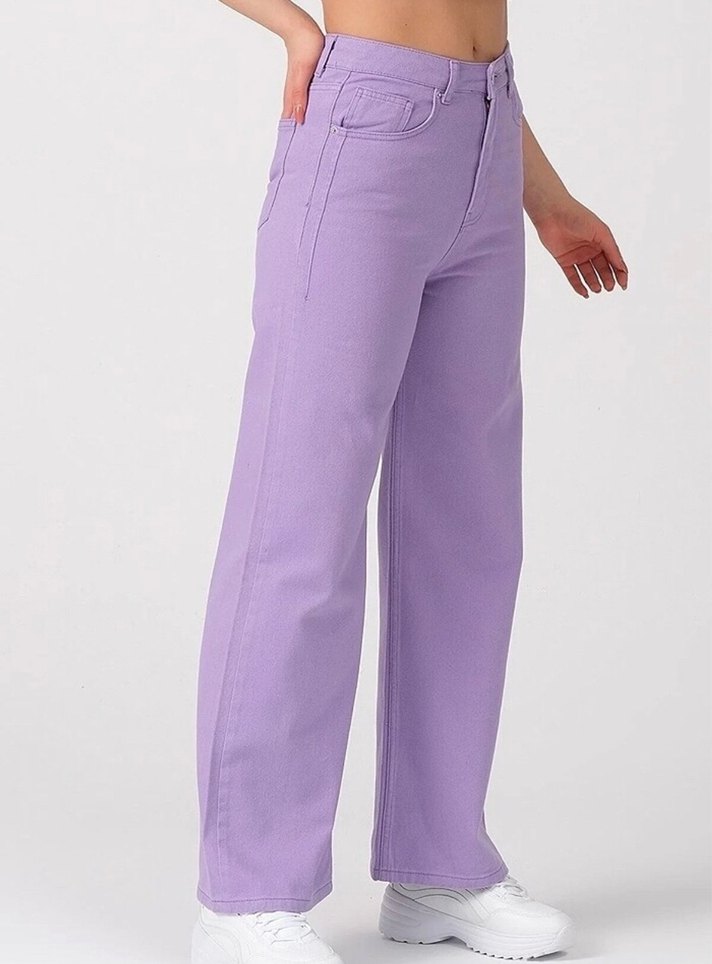 Mor renkte, regular fit kadın kot pantolon. Denim kumaştan üretilmiş, desensiz ve gündelik kullanıma uygun rahat bir stil sunar. #denim #kot #pantolon #kadın #jean #wideleg