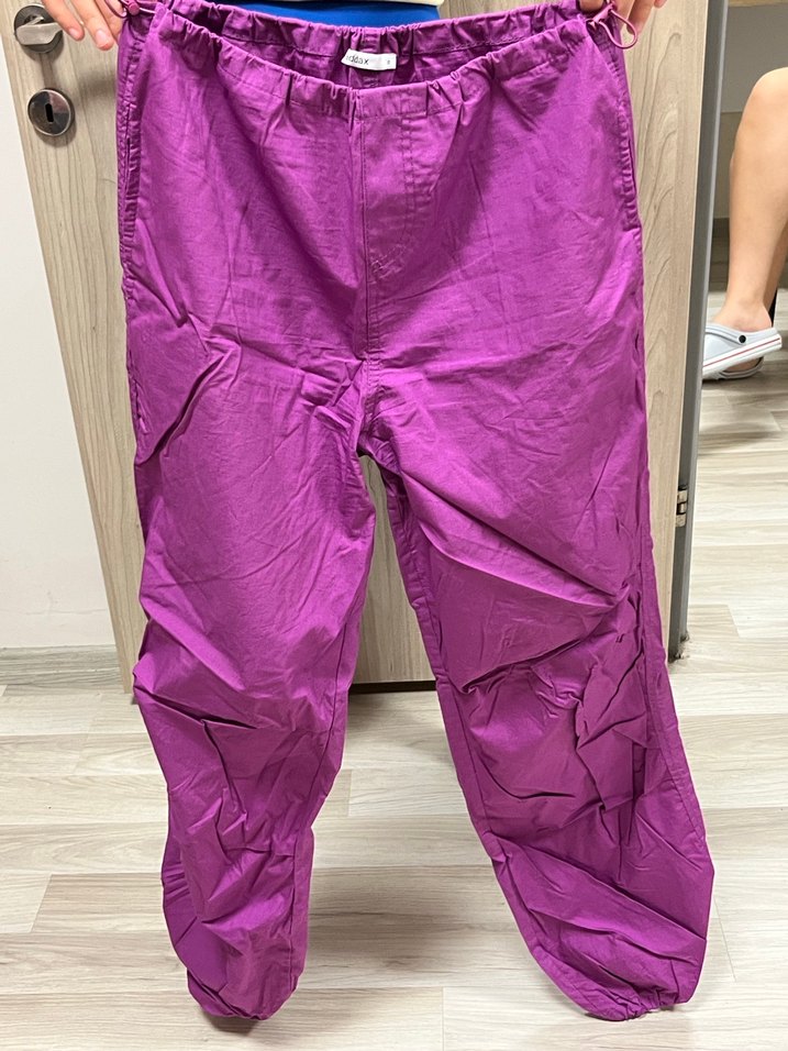 Günlük kullanıma uygun, parlak mor renkte, salaş kesim ve drapeli detaylara sahip kumaş pantolon. Sokak stiline uygun rahat bir model.