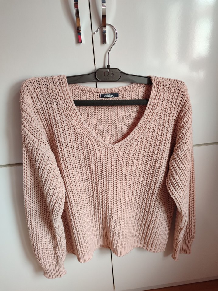 Pudra pembe renkli, V yaka ve uzun kollu örgü kadın kazak. Rahat ve bol kesimiyle günlük kullanıma uygun. yaka çok açık değil. standart beden small medium olur.