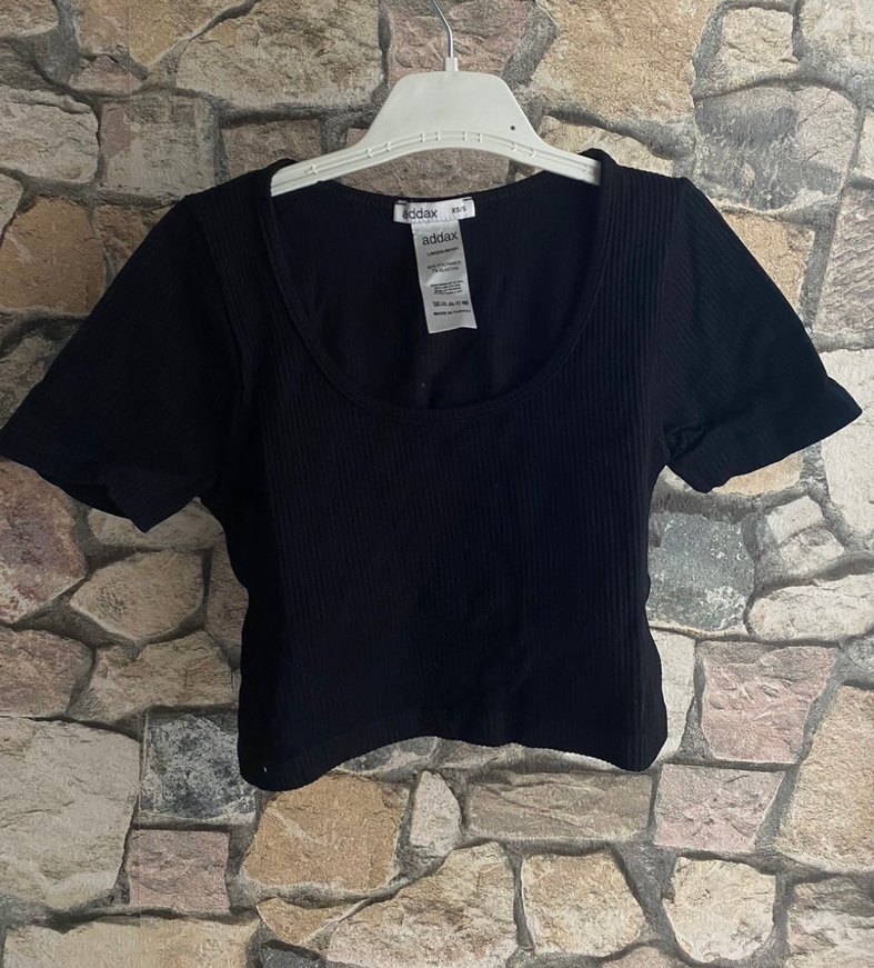 Siyah renkli, kısa kollu ve bisiklet yakalı crop top. Sentetik kumaştan, günlük kullanıma uygun şık ve rahat bir tasarım.