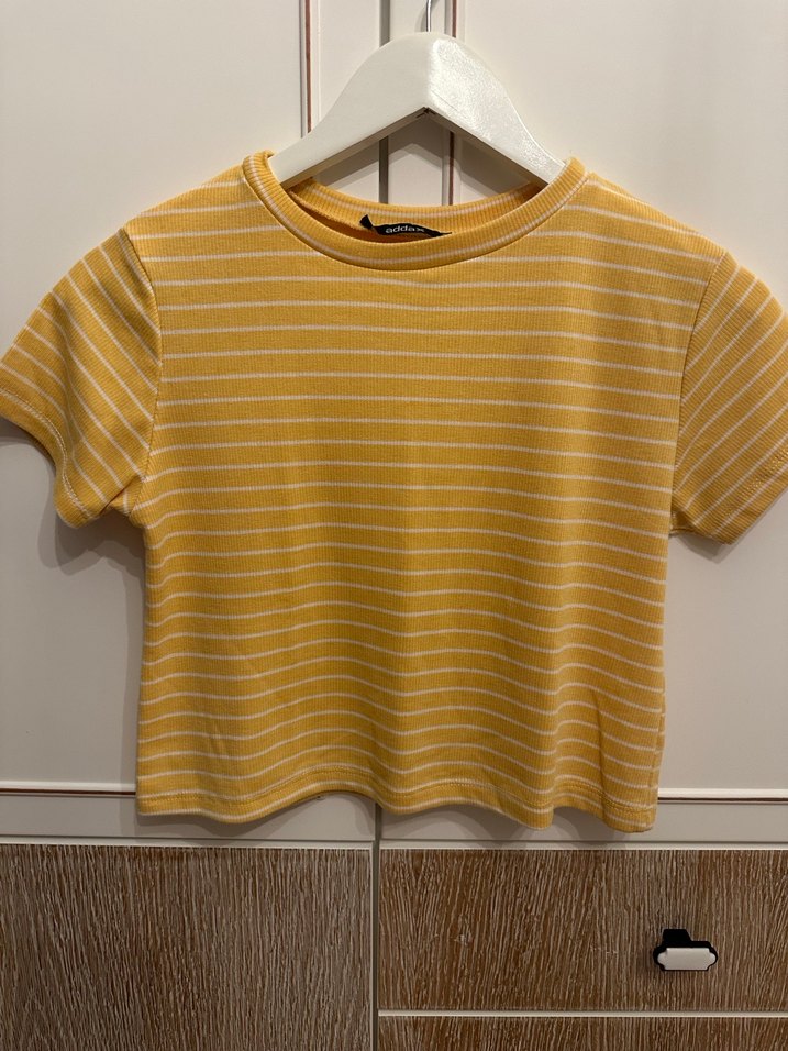 Hiç kullanılmadı, yenidir. Fitilli dokuma, oldukça likralı. Koltuk altı arası 40 cm, boy 40 cm. Etiket L ama S bedene uygun, biz S beden için almıştık. #addax #addaxtişört #tişört #bluz #çizgilitişört