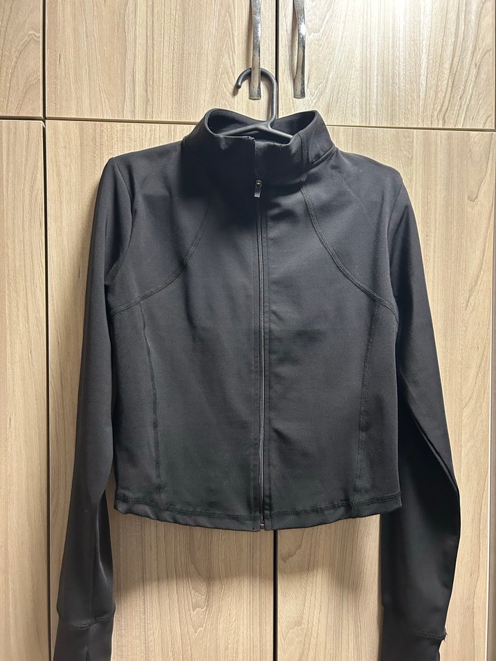Fermuarlı, yüksek yakalı ve uzun kollu, vücuda oturan bu kadın ceketi, sentetik dokulu kumaştan üretilmiştir ve günlük spor şıklığına uygundur.
