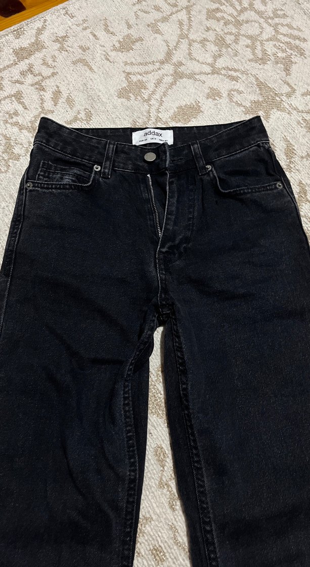 Addax siyah denim pantolon, normal kesim ve midi boyda. Minimalist, desen içermeyen tasarımı günlük kullanıma uygun, rahat ve şık bir görünüm sunar.