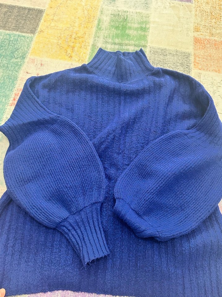 Mavi renkli, boğazlı ve uzun kollu örgü kadın kazak, rahat ve bol kesimlidir. Desensiz sade tasarımıyla günlük sokak stiline uygundur.
