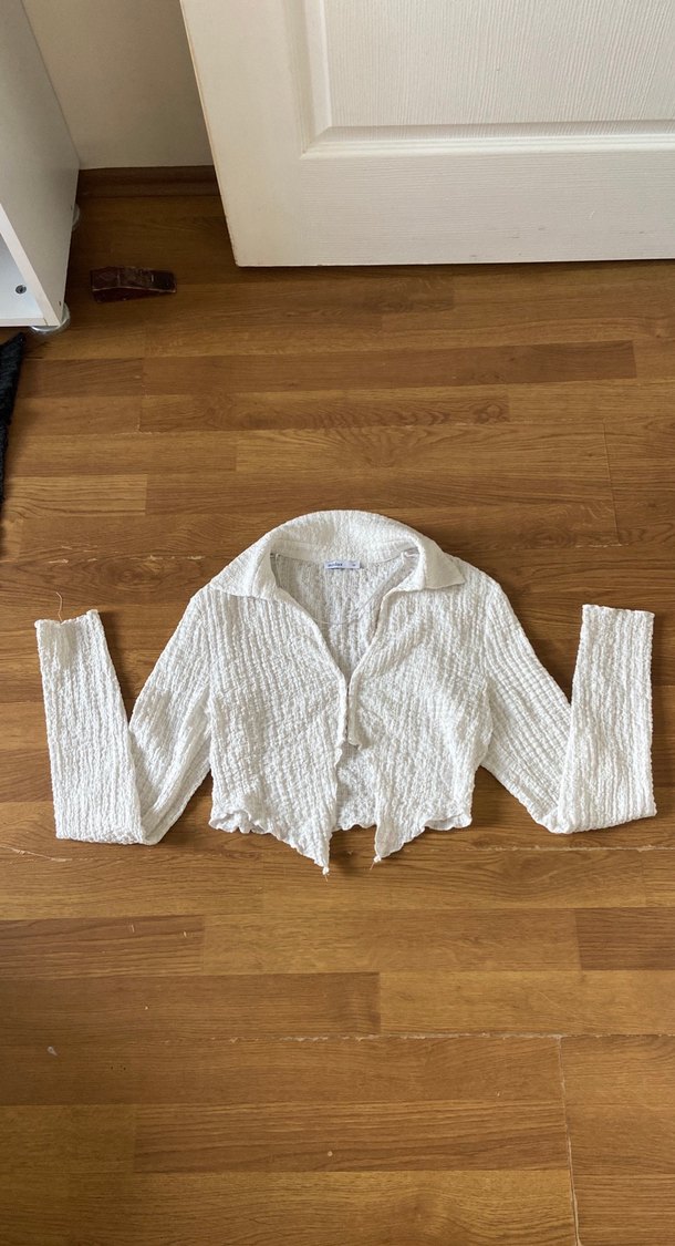 Beyaz, keten kumaştan, uzun kollu, yakalı ve örgü dokulu, bohem tarzda, günlük kullanıma uygun, fitted kesim kadın hırka. ☁️