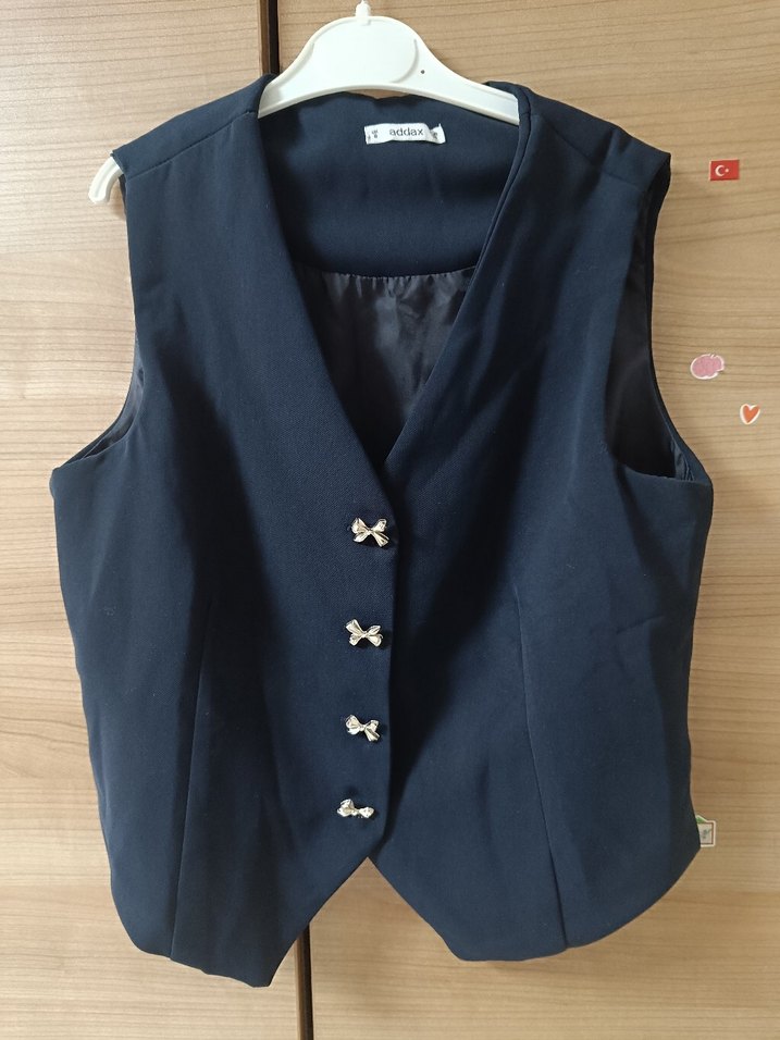 Düğmeli, koyu mavi kadın yelek, notched lapel yakalı ve kolsuzdur. Ofis kullanımı için uygun, normal kesim ve midi boyda, sentetik kumaştan üretilmiştir.