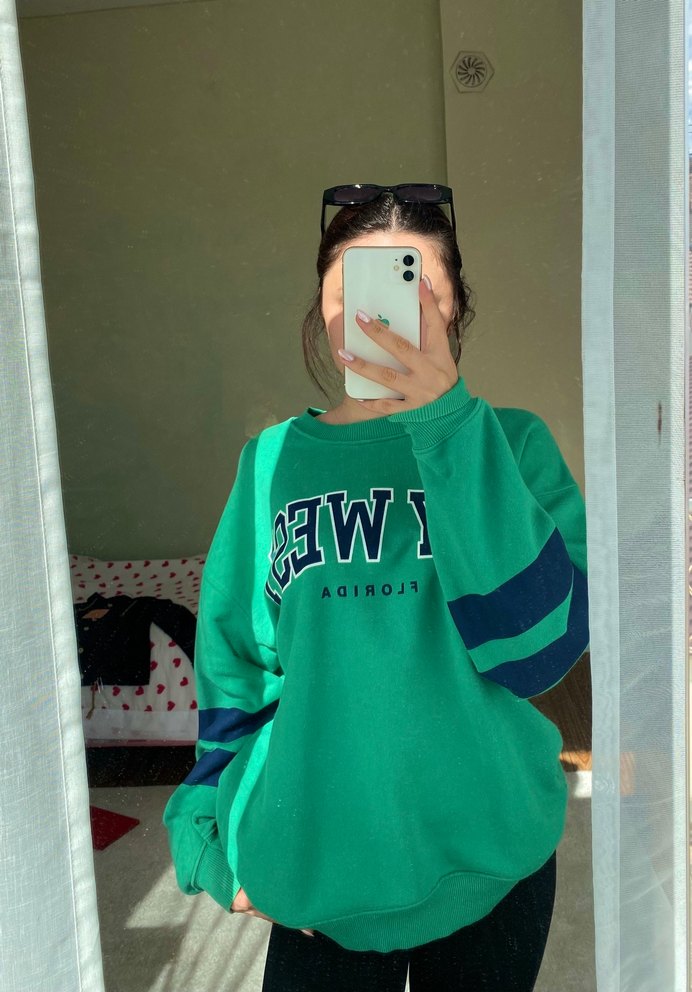 Uzun kollu, yuvarlak yakalı, baskılı detaylı ve örme dokulu yeşil bol kesim sweatshirt. Yumuşak ve sıcak kumaştan, rahat kullanıma uygun. Hiç giymedim hediye geldi tarzıma uymadığı için satıyorum.