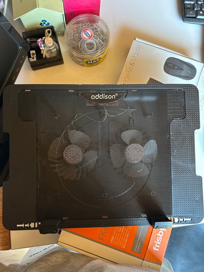 Addison marka siyah renkli, soğutucu fanlı laptop standı. Ayarlanabilir yükseklik ve hava sirkülasyonu sağlayan file yüzeye sahiptir. ÜRÜN SIKINTISIZ SORUNSUZ ÇALIŞMAKTADIR.