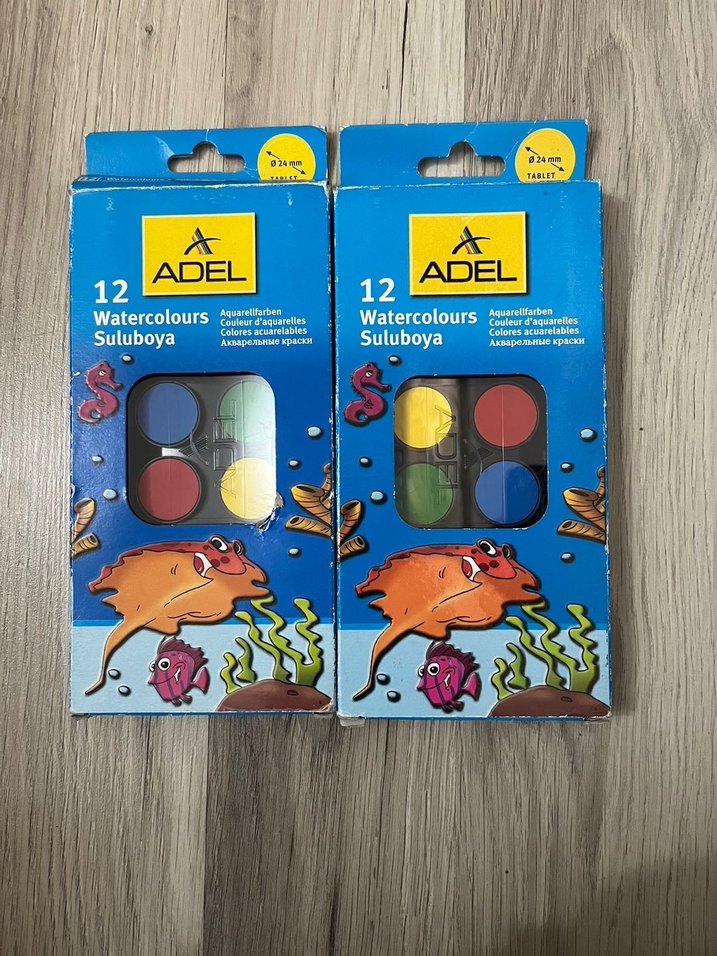 ADEL markasının 12 renkli suluboya seti, canlı renkleri ile çeşitli çizim ve boyama çalışmalarına uygundur. Her kutuda 12 adet suluboya bulunur. Tek ürün fiyatıdır