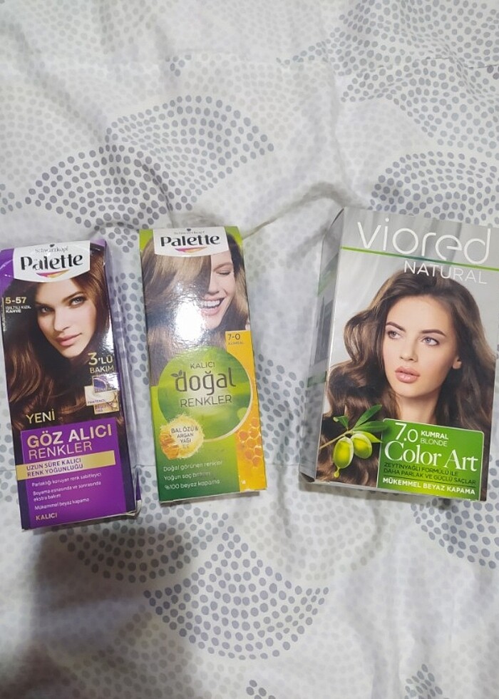 Sıfır kapalı ürünler ADET FİYAT....saç boyasi..2 adet 7.0 kumral 1 adet ışıltılı kızıl kahve ...adet fiyatıdır...iade almıyorum bilerek alim yapınız detay sorunuz ..(mağaza fiyatları 169 TL indirimsiz .)