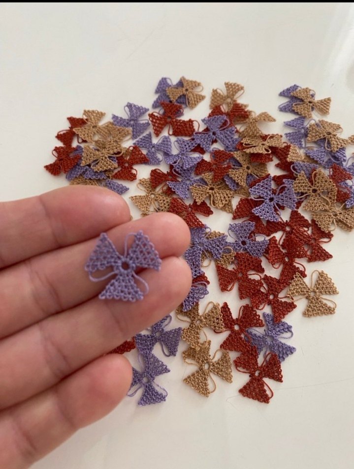 Mor, bej ve kiremit renklerinde el yapımı bohem tarzda dantel fiyonklar, el işi ve süsleme için uygun.