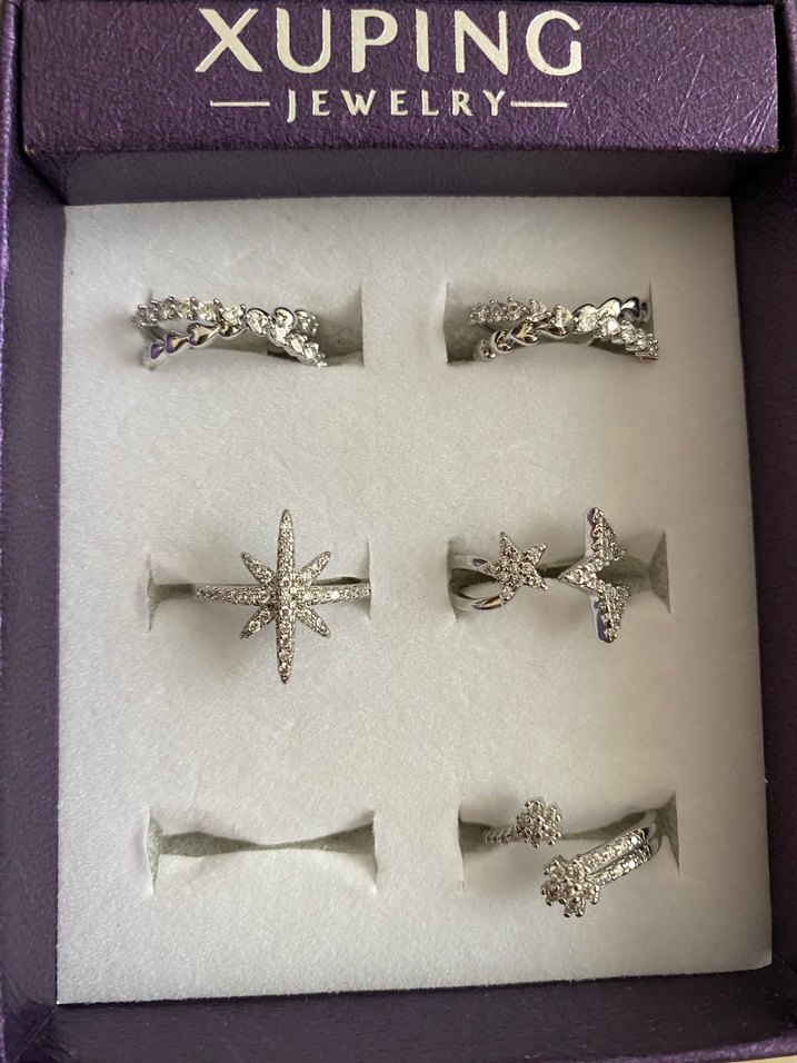 Xuping markalı beyaz, işlemeli ve payetli detaylara sahip yüzük seti. Minimalist ve bohem tarzda, düğün için uygun.