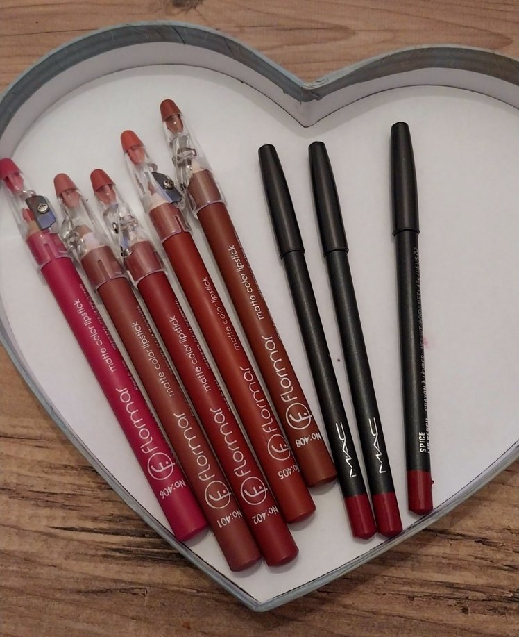 Flormar ve MAC markalarına ait koyu kırmızı dudak kalemleri. Kesin dudak konturu ve kalıcı kullanım için yumuşak yapıya sahiptir.