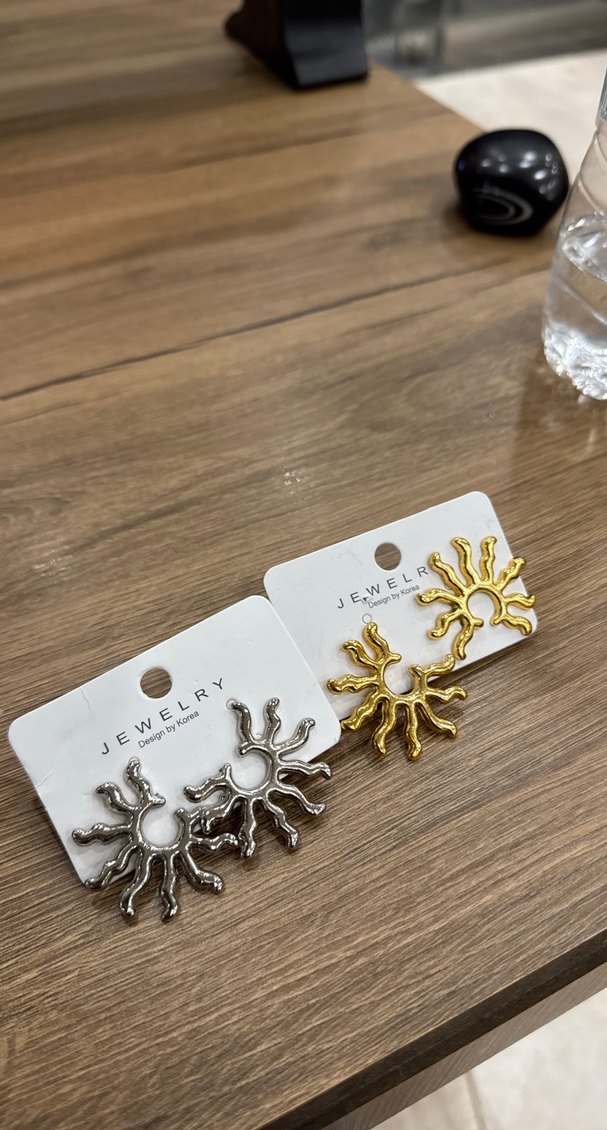 Altın ve gümüş renklerde, kısa uzunlukta, parlak ve güneş figürlü, minimalist bohem tarzda küpeler. Günlük kullanım için uygundur.