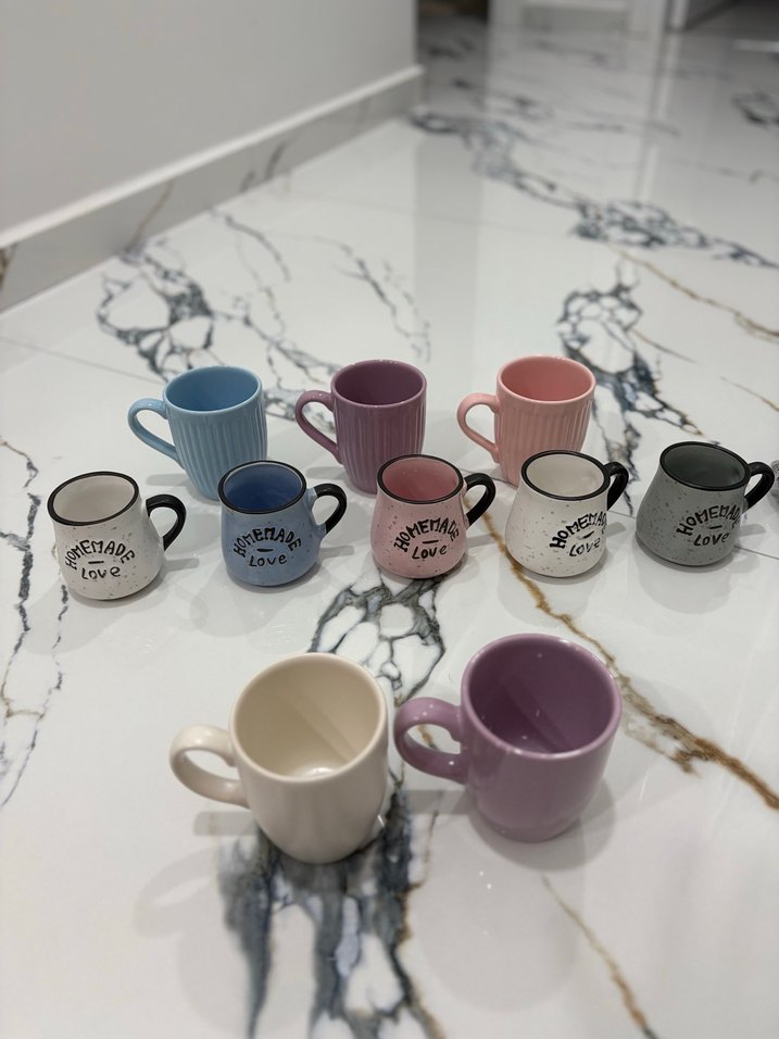 ADET FİYATIDIR. Mavi, mor, pembe ve krem tonlarında pastel renkli mini seramik fincanlar seti. Bazı fincanlarda "Homemade Love" yazısı bulunur. ☕