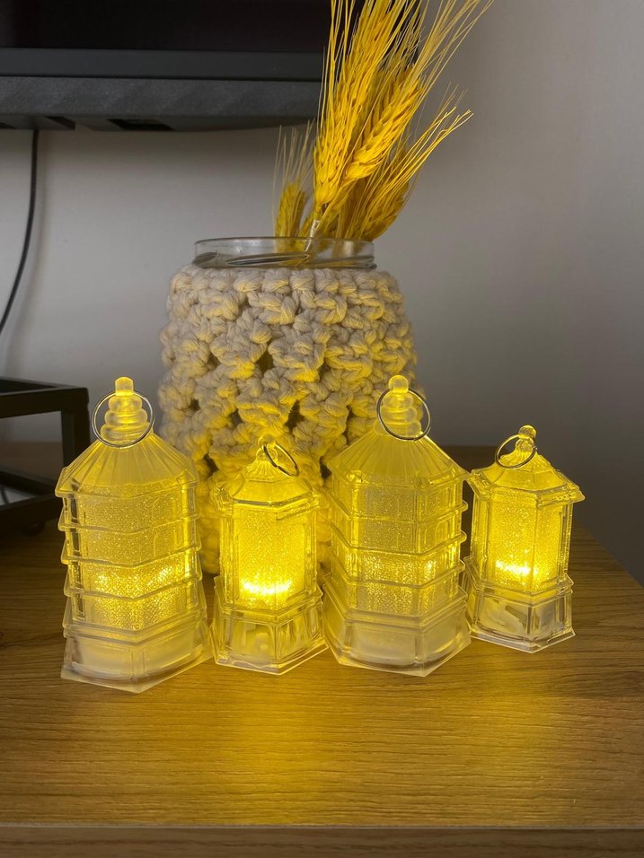 Dört adet ev şeklinde, açık sarı renkte LED mum seti. Sıcak ve dekoratif bir ışık sağlar. ️