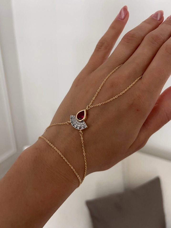 Bordo desenli detay ve ince zincirlerden oluşan bohem tarz kadın el zinciri, düğünler için uygun. ✨