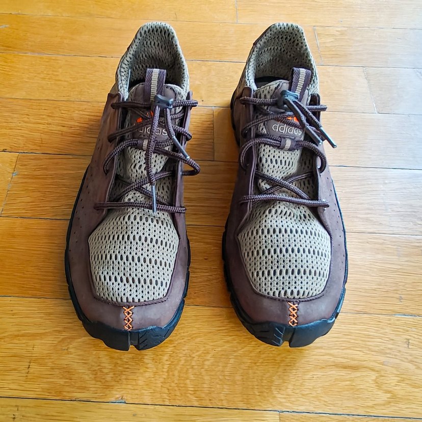 Nefes alabilir file üst yüzeyli, bağcıklı kahverengi erkek outdoor ayakkabısı, kauçuk tabanlı ve sokak stiline uygun. Adidas marka. Sadece birkaç kere giyildiğinden temiz ve yeni durumda. Numara 46, ancak ilan seçeneğinde 46 bulunmadığından numara tek ebat olarak seçildi.
