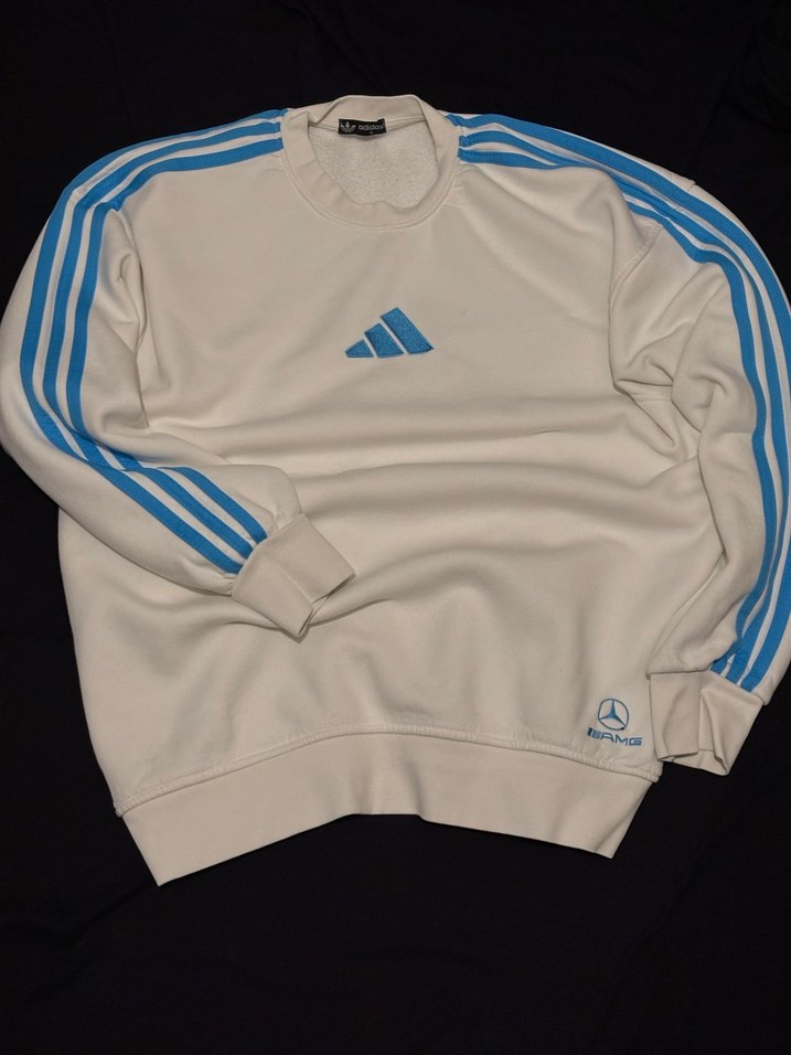 Erkek sweatshirt, uzun kollu ve yuvarlak yakalıdır. Kollarında mavi şeritler ve göğüste mavi adidas logo bulunur. Yumuşak ve sıcak kumaştan üretilmiştir. Günlük kullanıma uygundur.