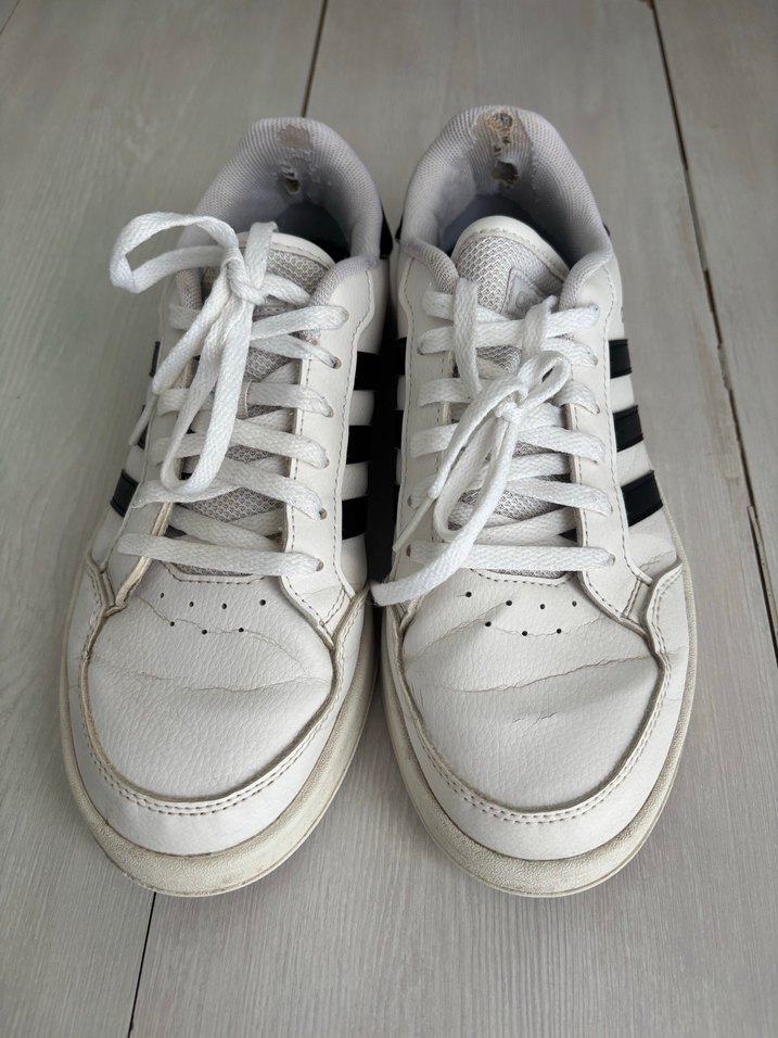 Beyaz renkli, siyah çizgili kadın spor ayakkabısı. Kauçuk tabanlı, bağcıklı, rahat ve sportif sokak stili için uygundur.