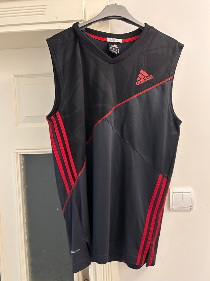 V yakalı Adidas formasıdır. Koyu renkli sentetik kumaştan, kırmızı baskılı detaylı ve velcro özelliklidir. Spor ve sokak stili için uygundur.