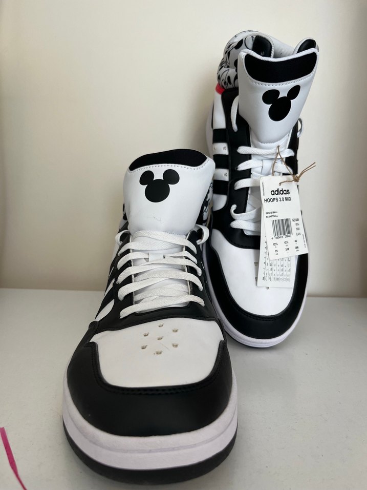 Adidas baskılı siyah beyaz basketbol ayakkabısı, kayışlı ve kauçuk tabanlı, sportif sokak stili için uygun. 46 47 48 numaralar mevcuttur etiketli Orjinal üründür