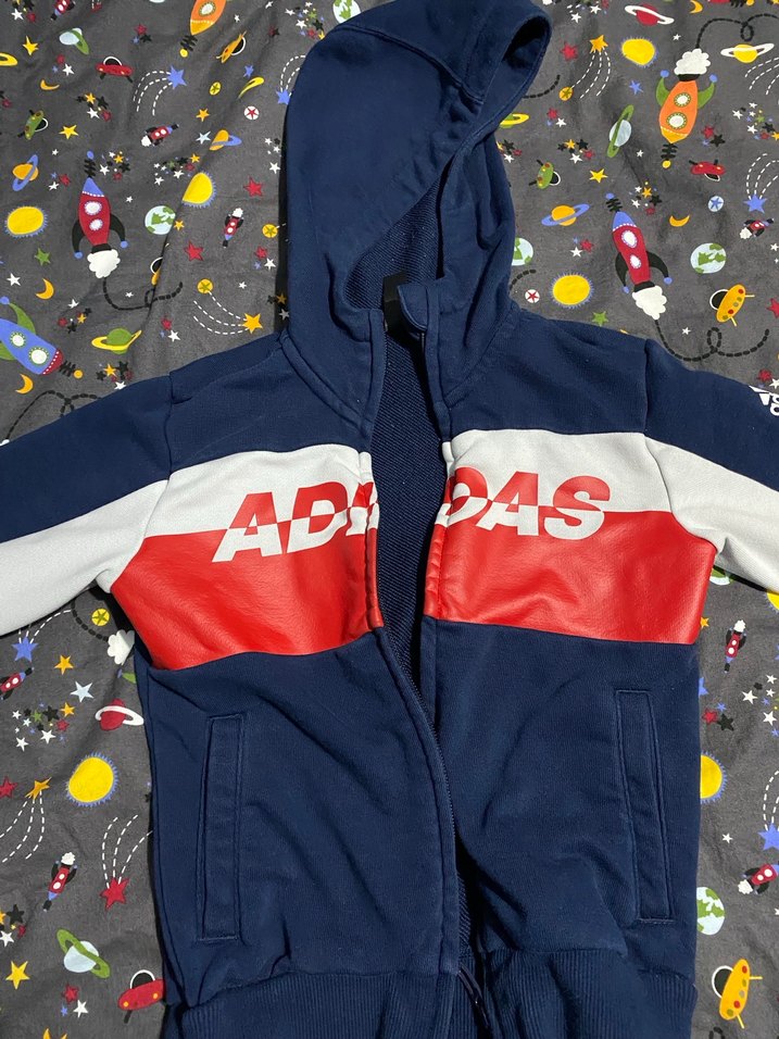 Kapüşonlu, fermuarlı ve renkli baskılı desene sahip, yumuşak ve sıcak kumaştan yapılmış erkek çocuk ceketi. Göğüs kısmında 'ADİDAS' yazısı bulunur. Sadece fermuar kısmı fotoğrafta görüldüğü gibidir