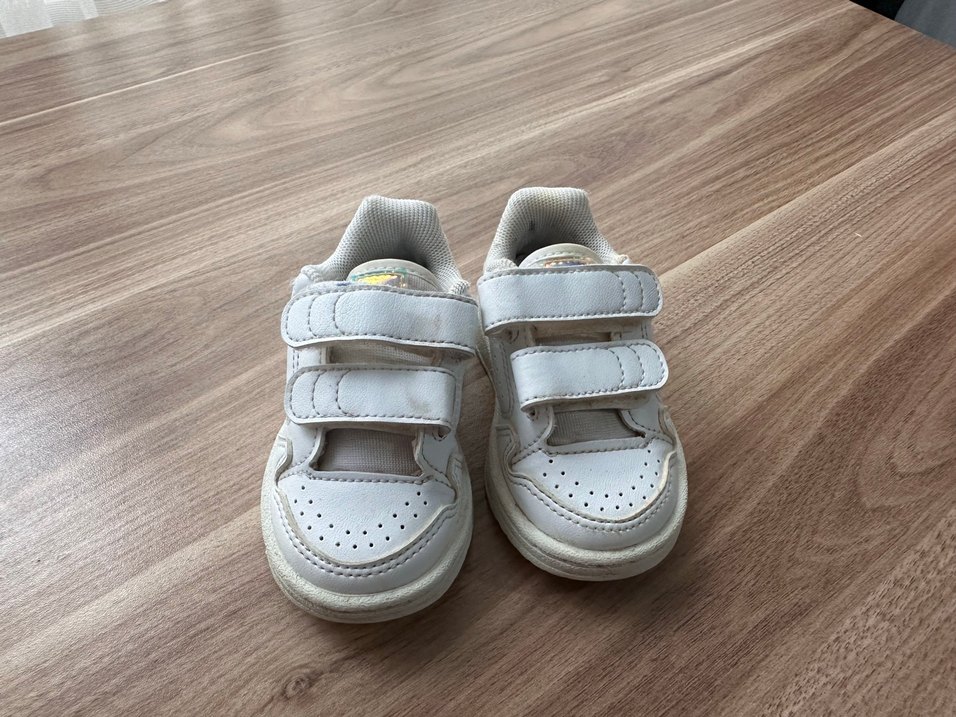 Beyaz renkte, cırt cırtlı çocuk spor ayakkabısı, kauçuk tabanlı ve sade sokak stili için uygun.