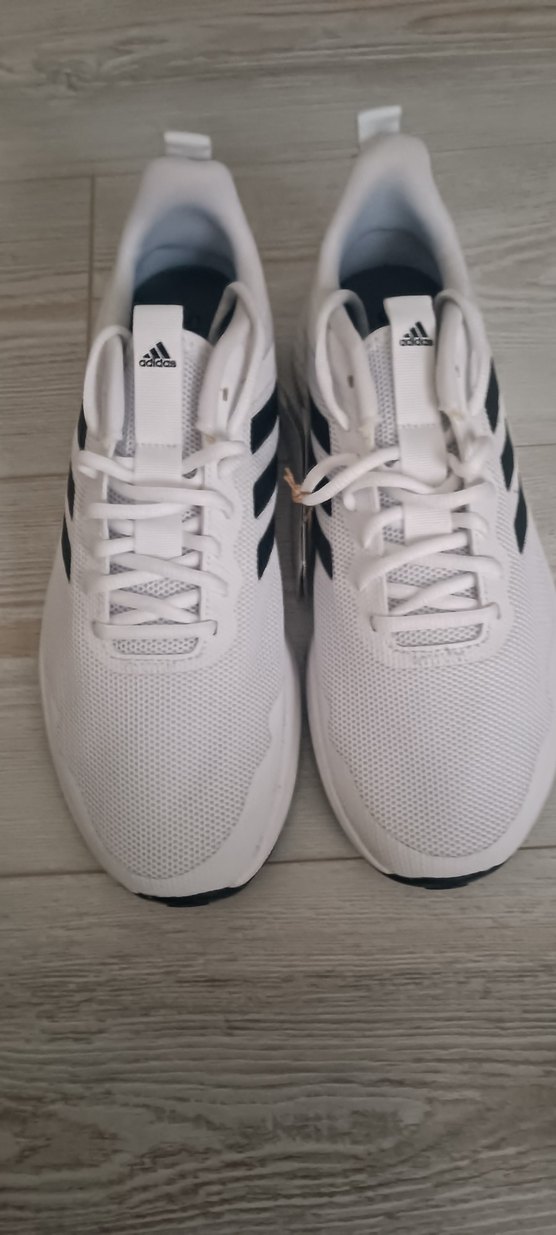 Adidas beyaz erkek koşu ve antrenman ayakkabısı, siyah şerit detaylıdır. Bağcıklı tasarımı ve kauçuk tabanlıdır, spor ve sokak stiline uygundur.