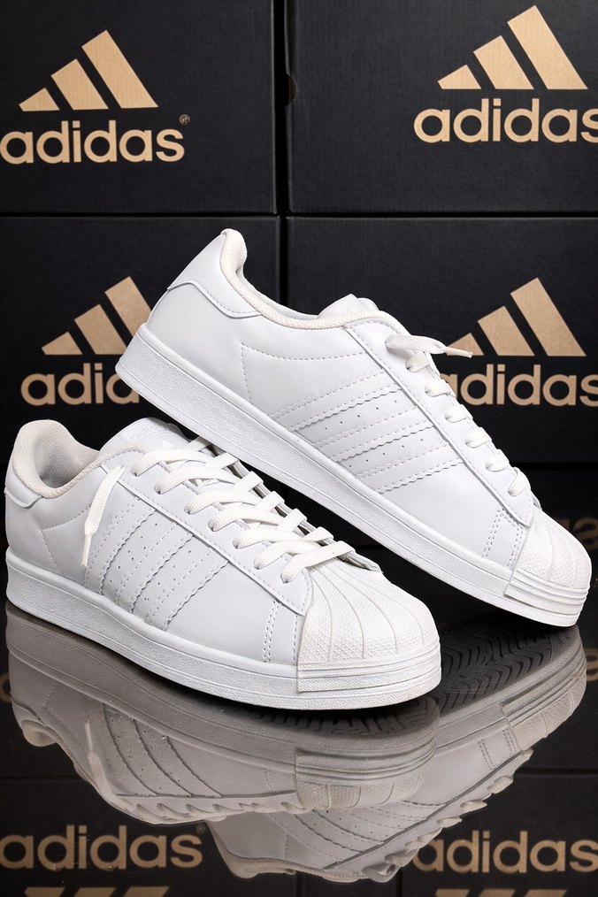 Adidas beyaz, spor ayakkabısı, kauçuk taban ve rahat tasarımıyla spor ve sokak modasını birleştirir.