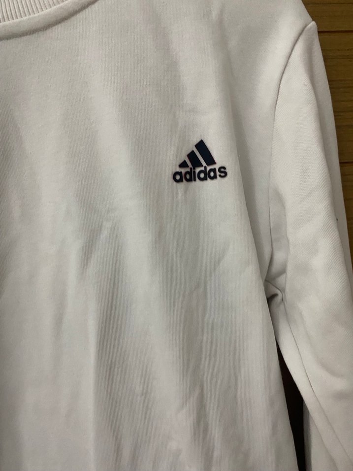 adidas beyaz sweatshirt, uzun kollu ve yuvarlak yaka. Pamuklu, bol kesim, gri adidas baskılı. Spor ve gündelik tarz için uygun. ⚽