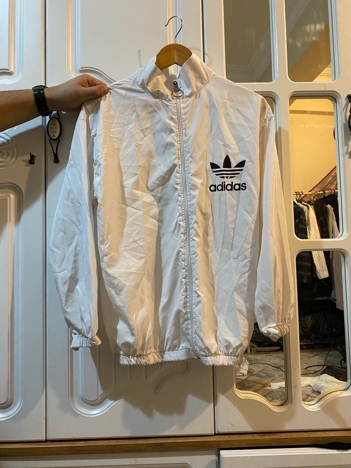 adidas beyaz erkek yağmurluğu, uzun kollu, fermuarlı ve midi boyda. Hafif plastik malzemeden üretilmiş, dış mekan kullanımı için uygun. Üzerinde adidas logosu bulunur. ️