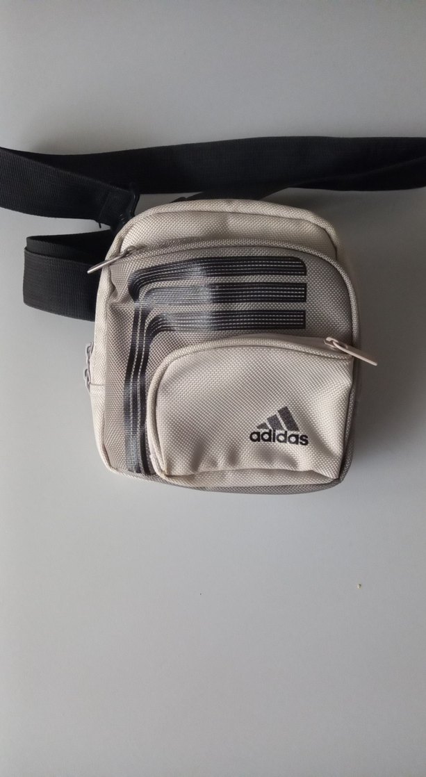 adidas marka beyaz ve gri baskılı, kemerli omuz çantası. Sokak modası ve trend giyime uygun.