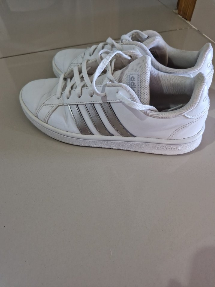Beyaz ve gri renklerde, kauçuk tabanlı Adidas spor ayakkabılar. Sokak modasına uygun, rahat ve şık tasarım sunar.