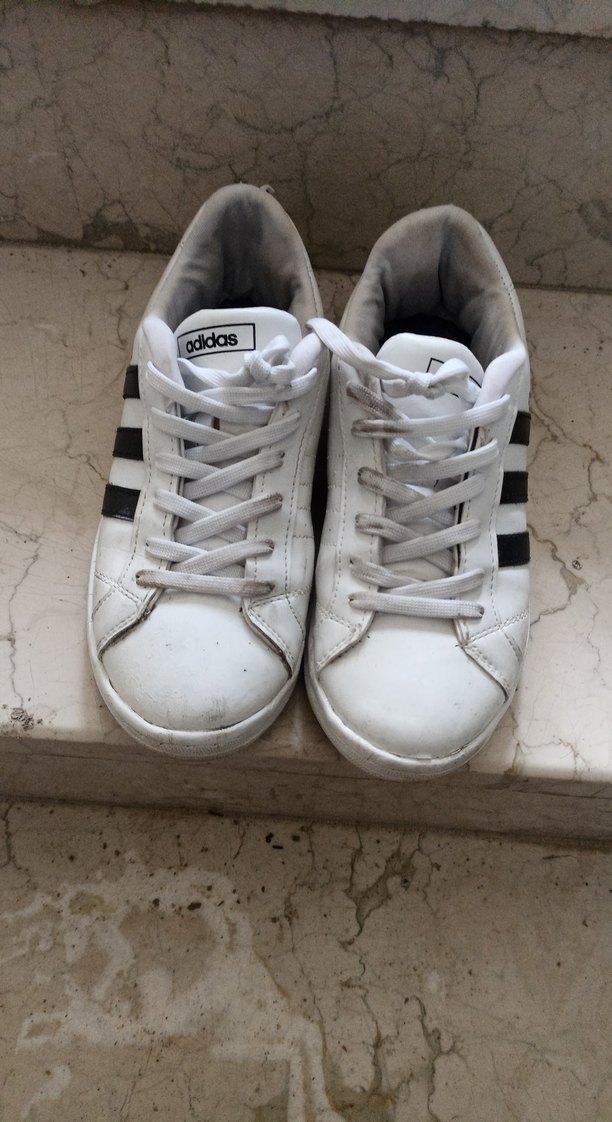 Beyaz Adidas kadın spor ayakkabısı, siyah çizgilerle, düz kauçuk tabanlı, rahat sportif stil. Athleisure ve sokak modasına uygun. kirli temizlenmesi gerek gitmedigim için kaldirdim