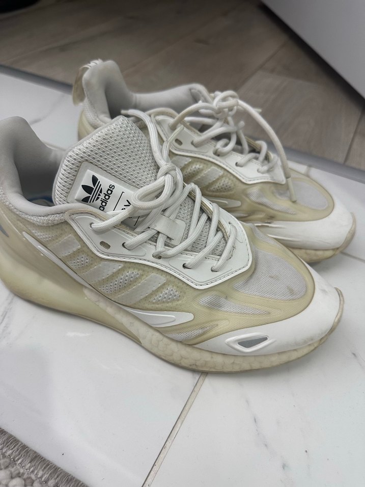 Beyaz Adidas sneaker, bağcıklı. Düz, desensiz tasarım, sokak stili ve spor için uygun. Kauçuk tabanlı. Orijinaldir.
