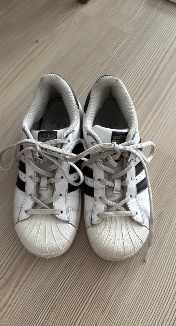 Adidas marka, beyaz tabanlı, siyah çizgili, bağcıklı, lastik tabanlı, düz topuklu spor ve günlük kullanıma uygun ayakkabılar.