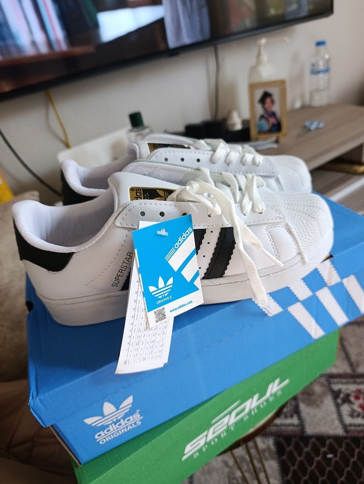 Beyaz siyah renkte Adidas kadın spor ayakkabısı, lastik tabanlı ve bağcıklı. Sokak stili ve sportif görünüm için uygun. Orijinal etiketli, mavi Adidas kutusunda.