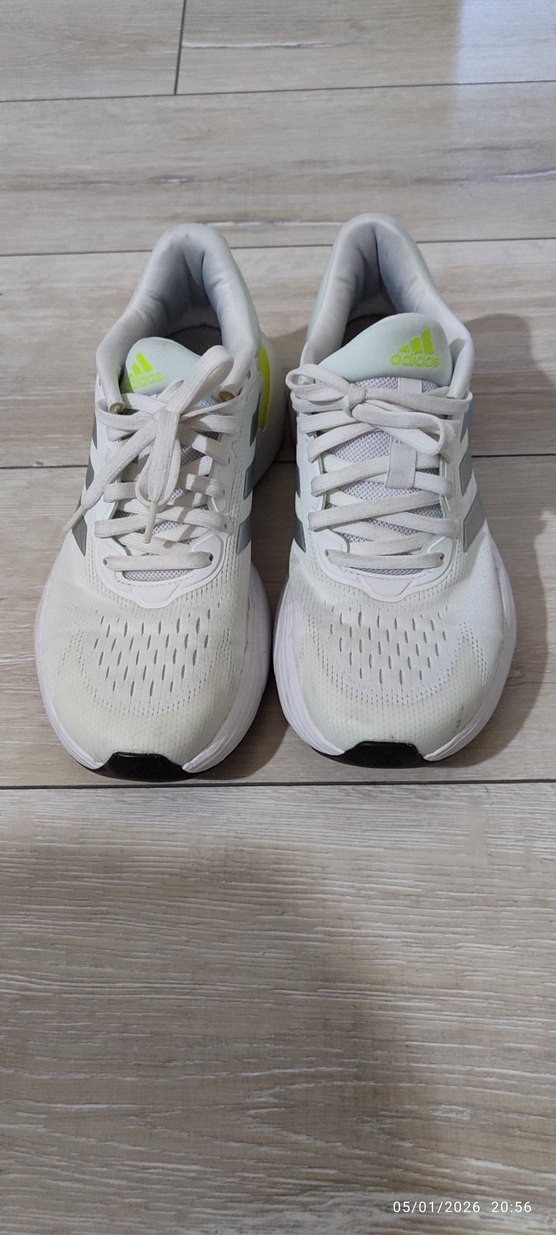 Adidas beyaz spor ayakkabı, bağcıklı ve düz kauçuk tabanlı. Spor ve günlük kullanım için rahat ve sade tasarım, gri detaylı. sadece spor salonu'nda kullanıldı