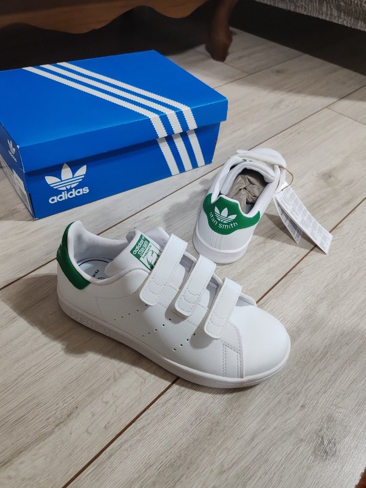 Adidas beyaz spor ayakkabılar, velcro bantlı ve kauçuk tabanlıdır. Streetwear tarzı ve athleisure rahatlığını bir arada sunar. Topuk tipi stiletto, desensiz tasarım.